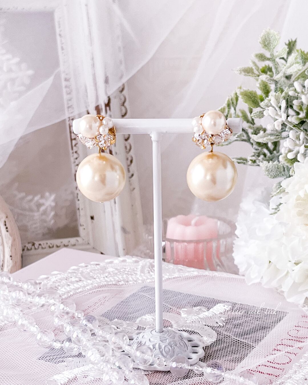 すっきりとまとめられたヘアスタイルに、輝くビジューと大きめパールがあなたの耳元で存在感を発揮します。