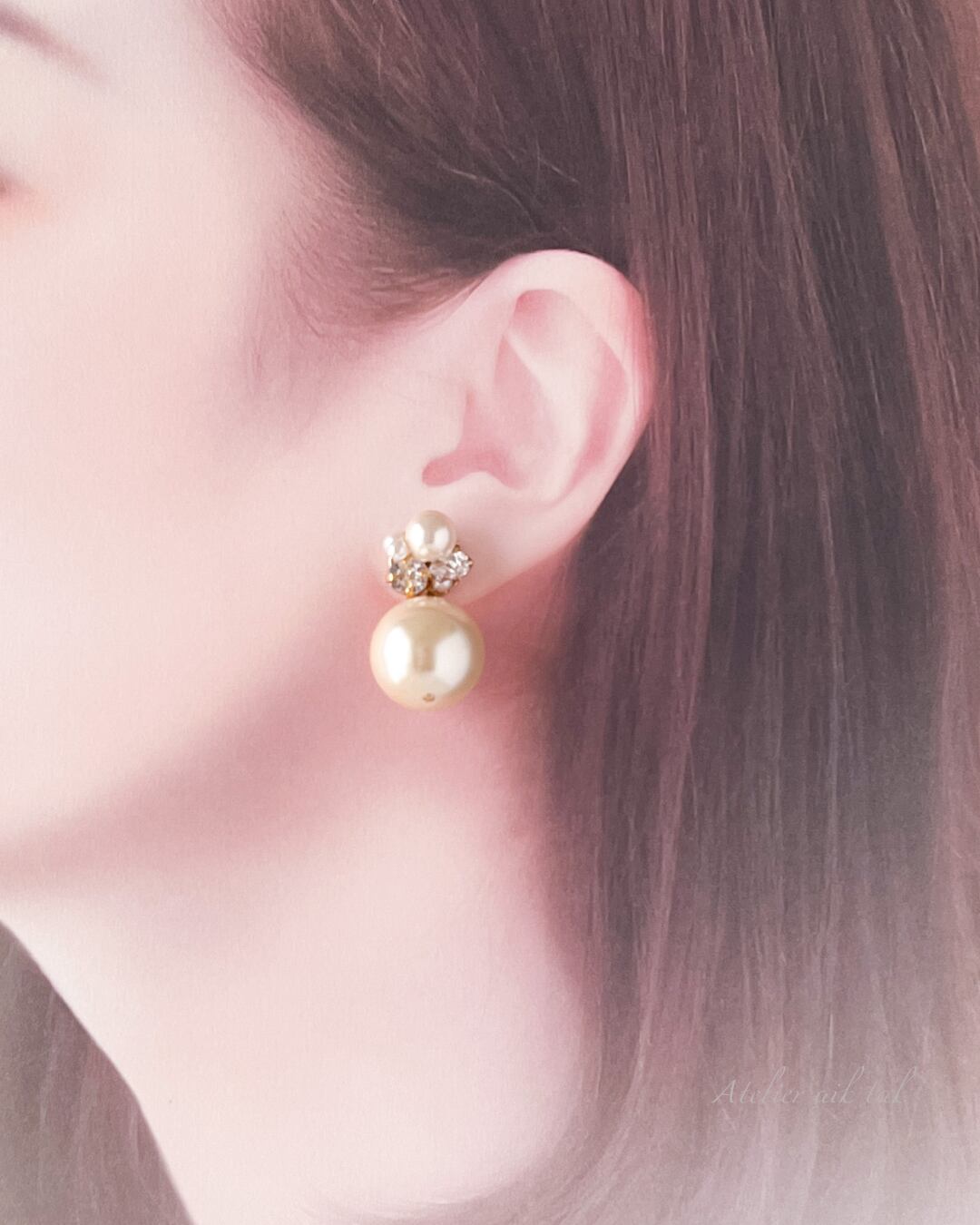 キラキラときらめくビジューと存在感バッチリなツヤツヤ樹脂パールがあなたのお顔周りを華やかにしてくれます。