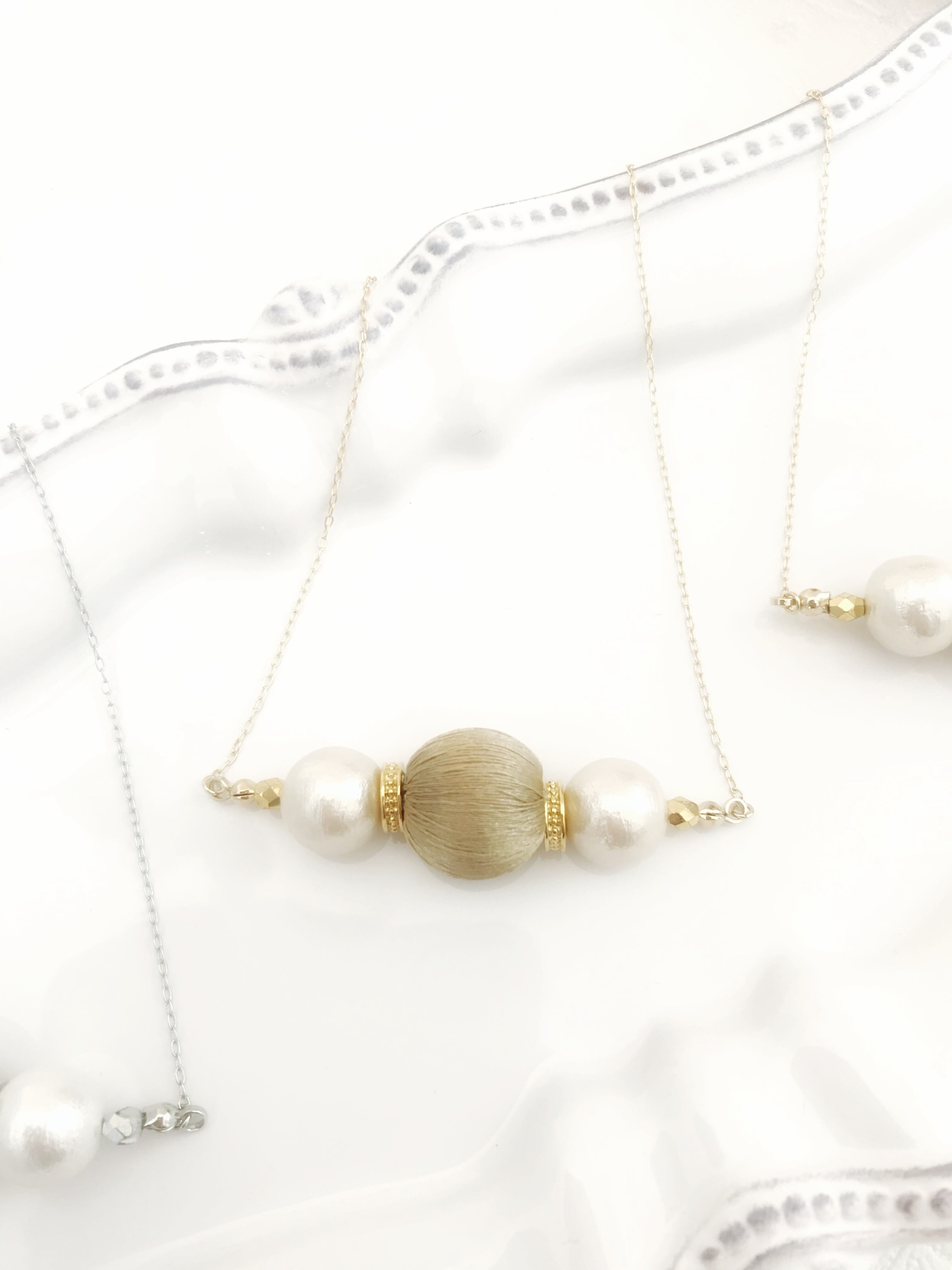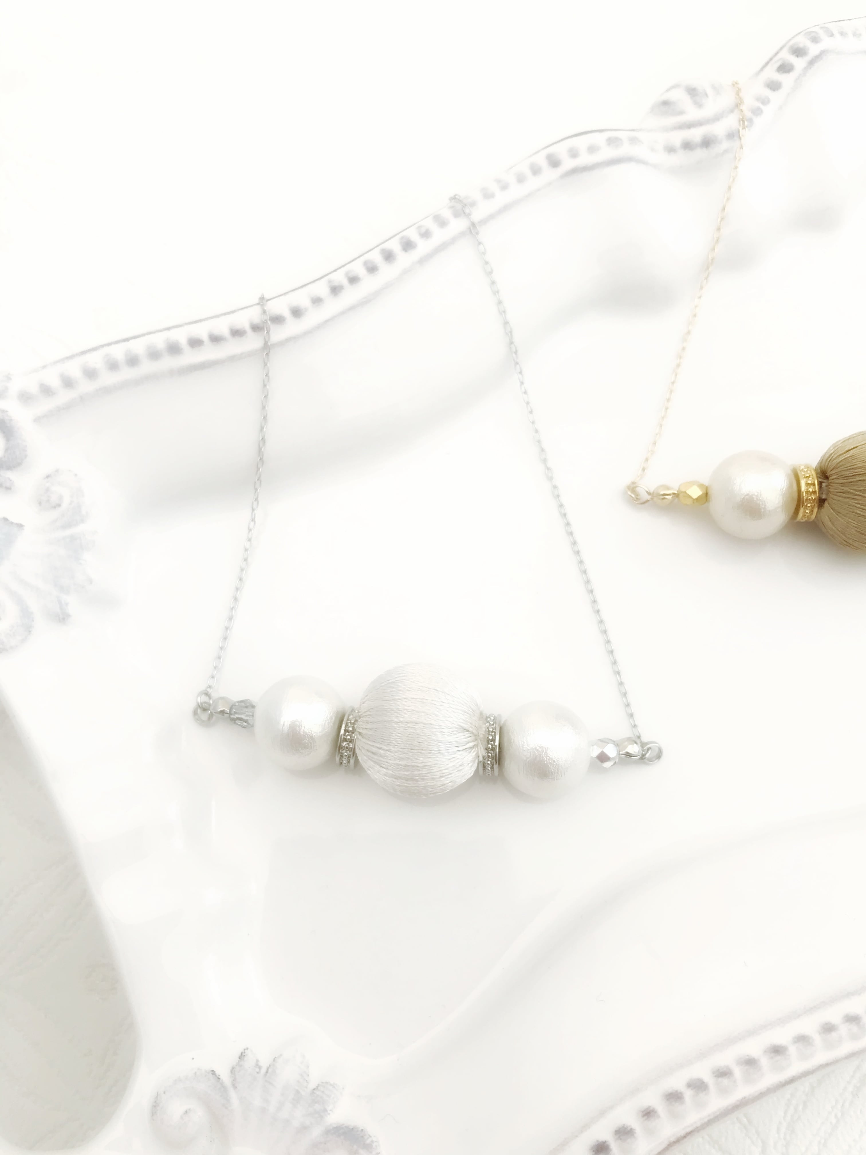 巻き玉を中心に、コットンパールやメタルリングパーツを配置し、上品な仕上がりになっています。