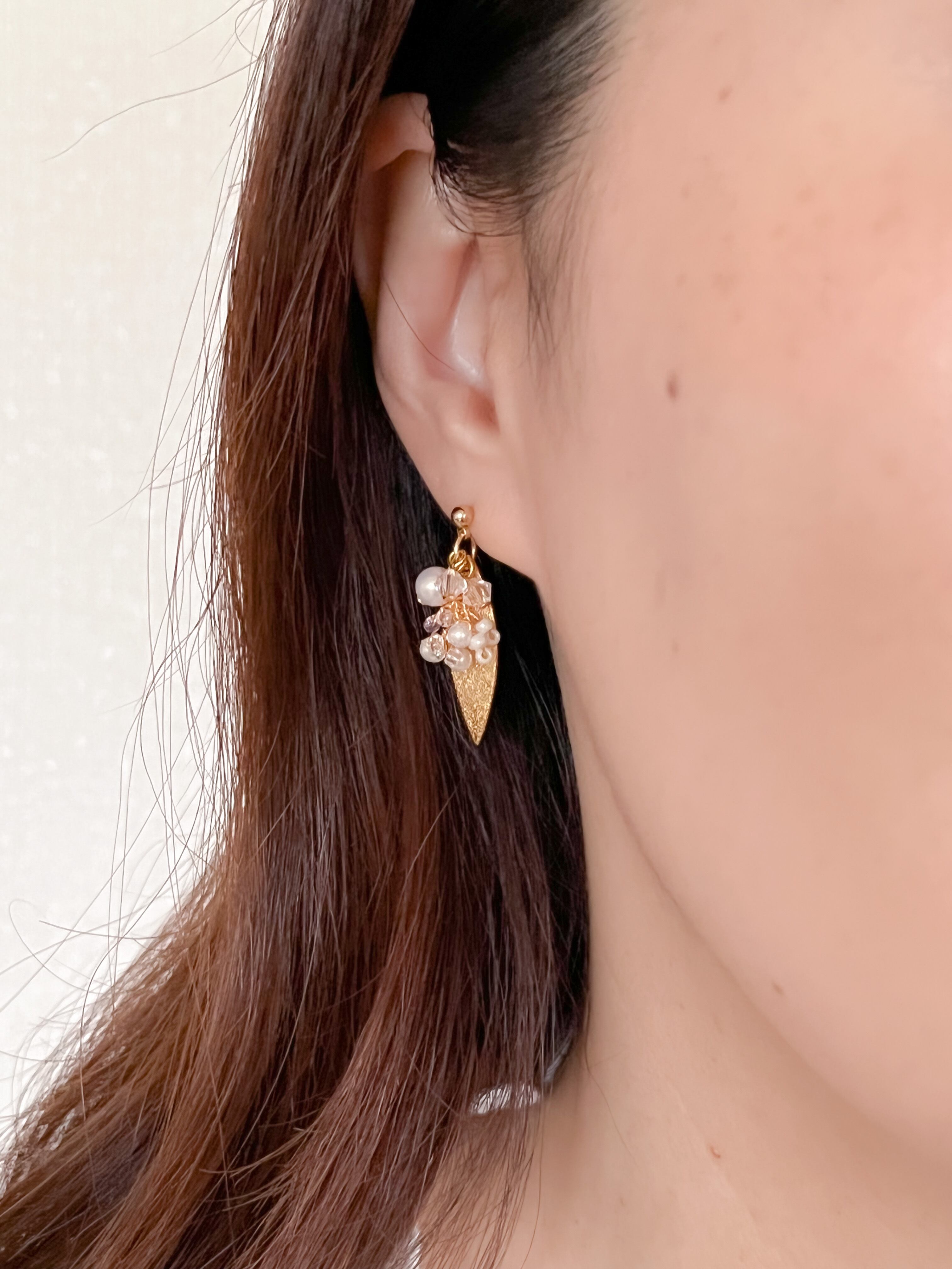 小花ビーズとスターダストリーフのピアス・イヤリング ゴールド