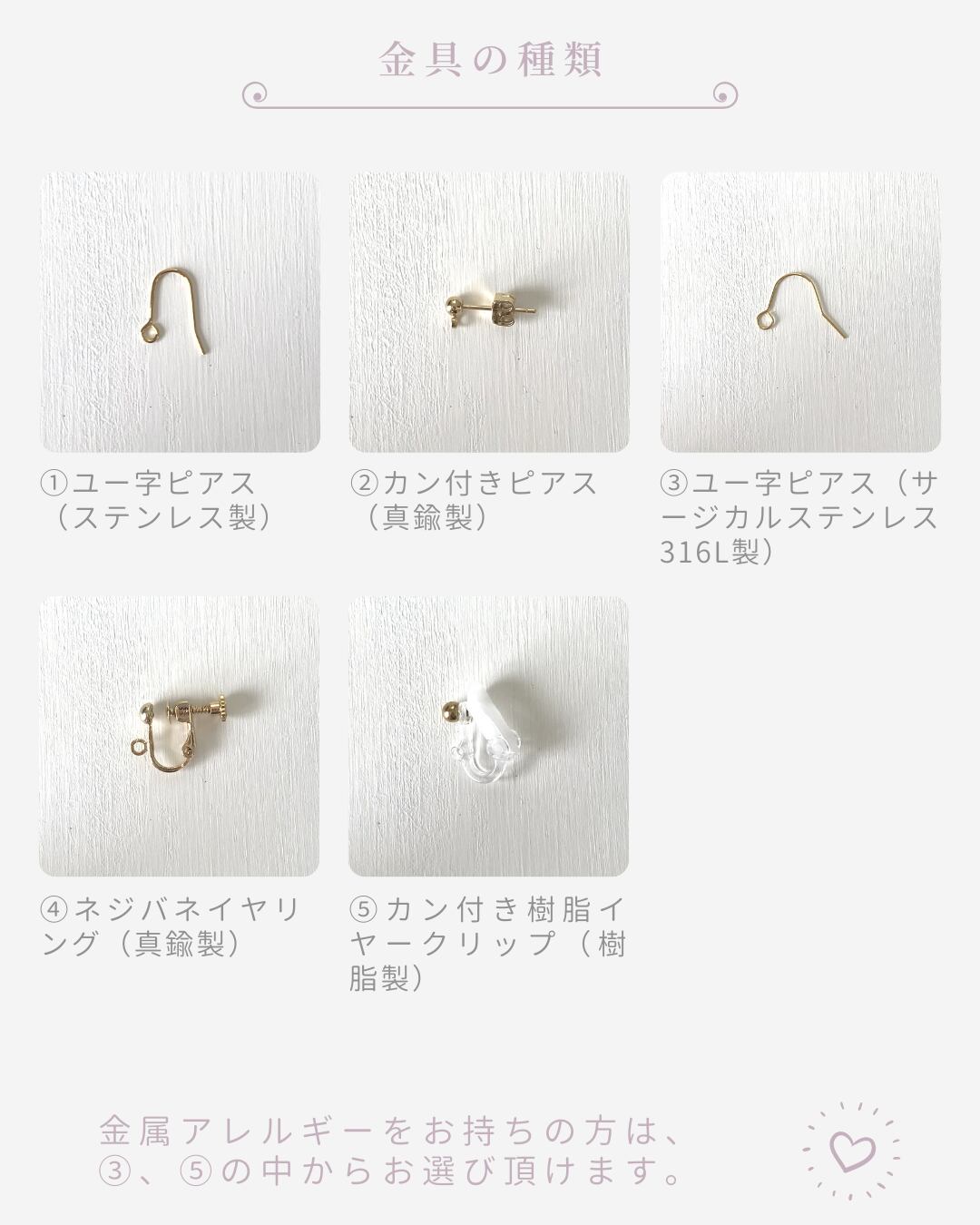 ※金属アレルギーの方にも配慮した、様々な素材のパーツををご用意しております。