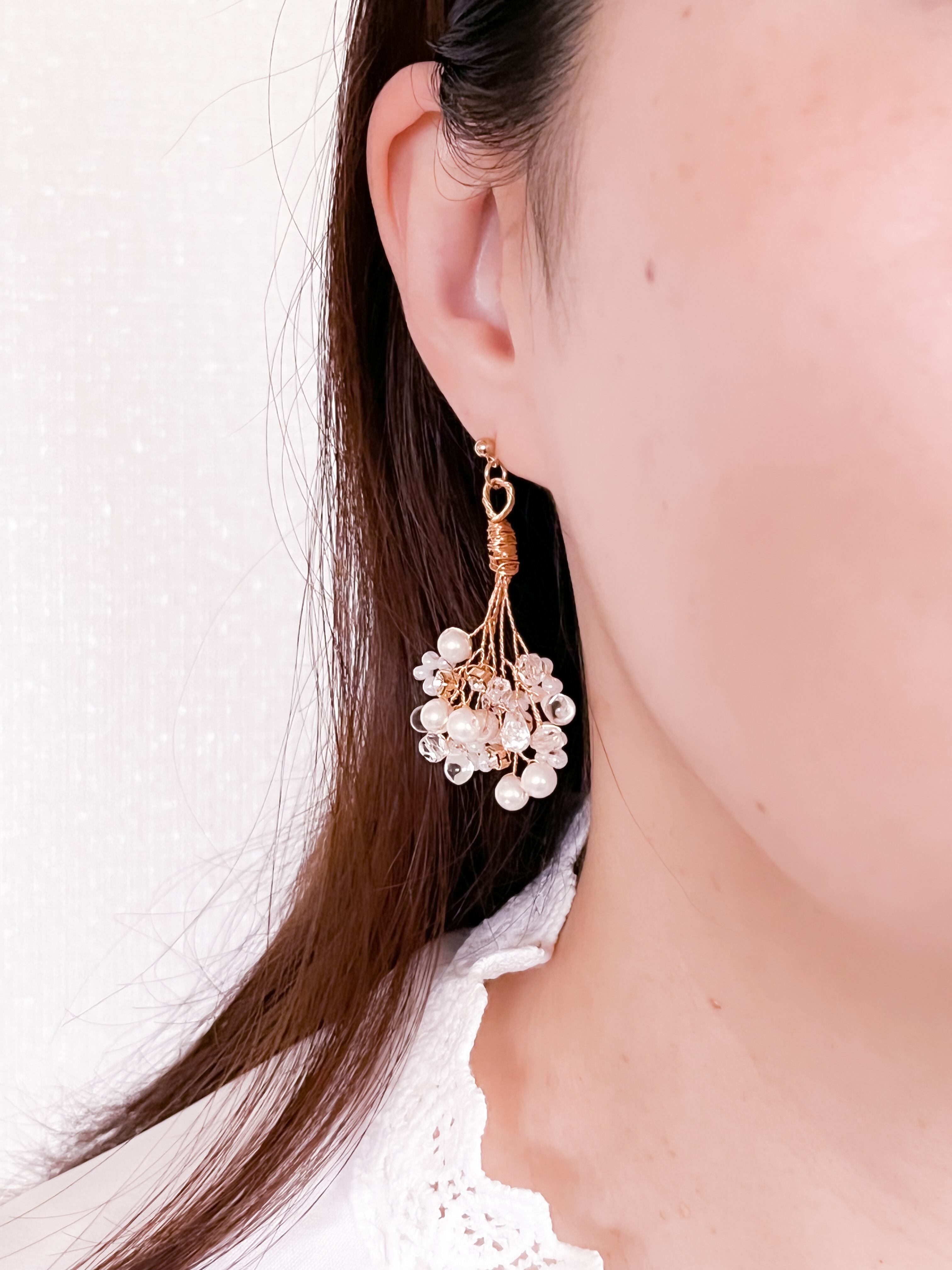 小枝パーツを束ねてブーケのようなイヤーアクセサリーとなっています。