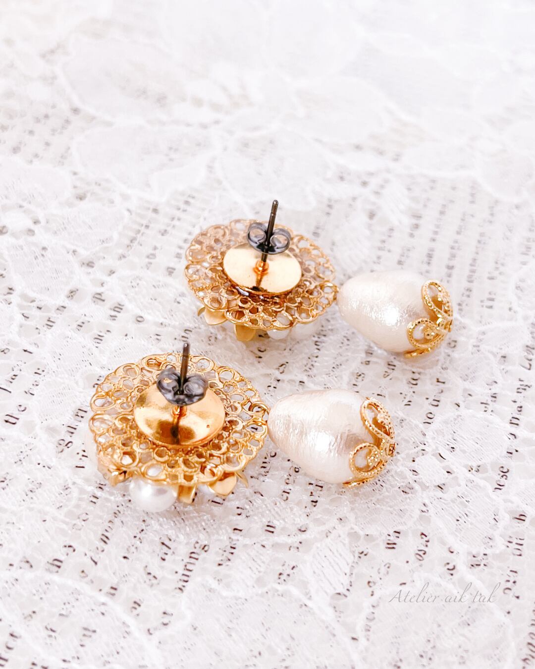 ゴールドの金属パーツに合う、温かみのあるクリーム色のコットンパールを合わせ、優しい色合いと素材感とでとても肌なじみがいいです。