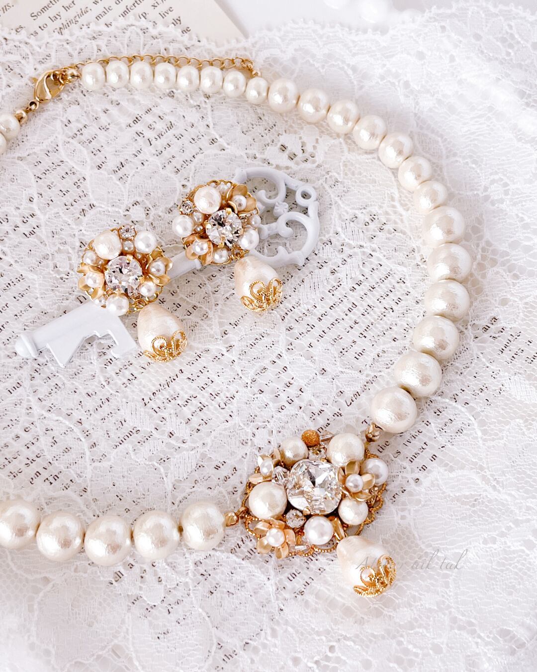 ビジューのきらめき、コットンパールのナチュラルな風合いが人目を惹きます。