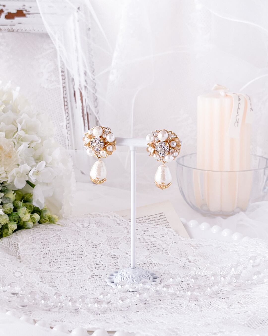 ルーズにまとめられたヘアスタイルの耳元で、かわいらしい小花が特長の丸いデザインとしずく型のコットンパールが存在感を発揮します。